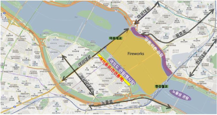 여의동로 및 여의상류 IC 등 인근 도로의 출입이 통제되고 대중교통이 확충 운행될 예정이라고 합니다.